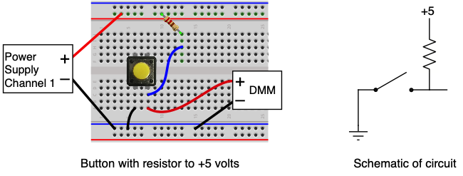 Note: What we have wired is an INCORRECT way of wiring a button. We want to show you that while you CAN produce a clean logic ‘0’ (low) voltage, you CANNOT produce a clean logic ‘1’ (high) voltage with this circuit.